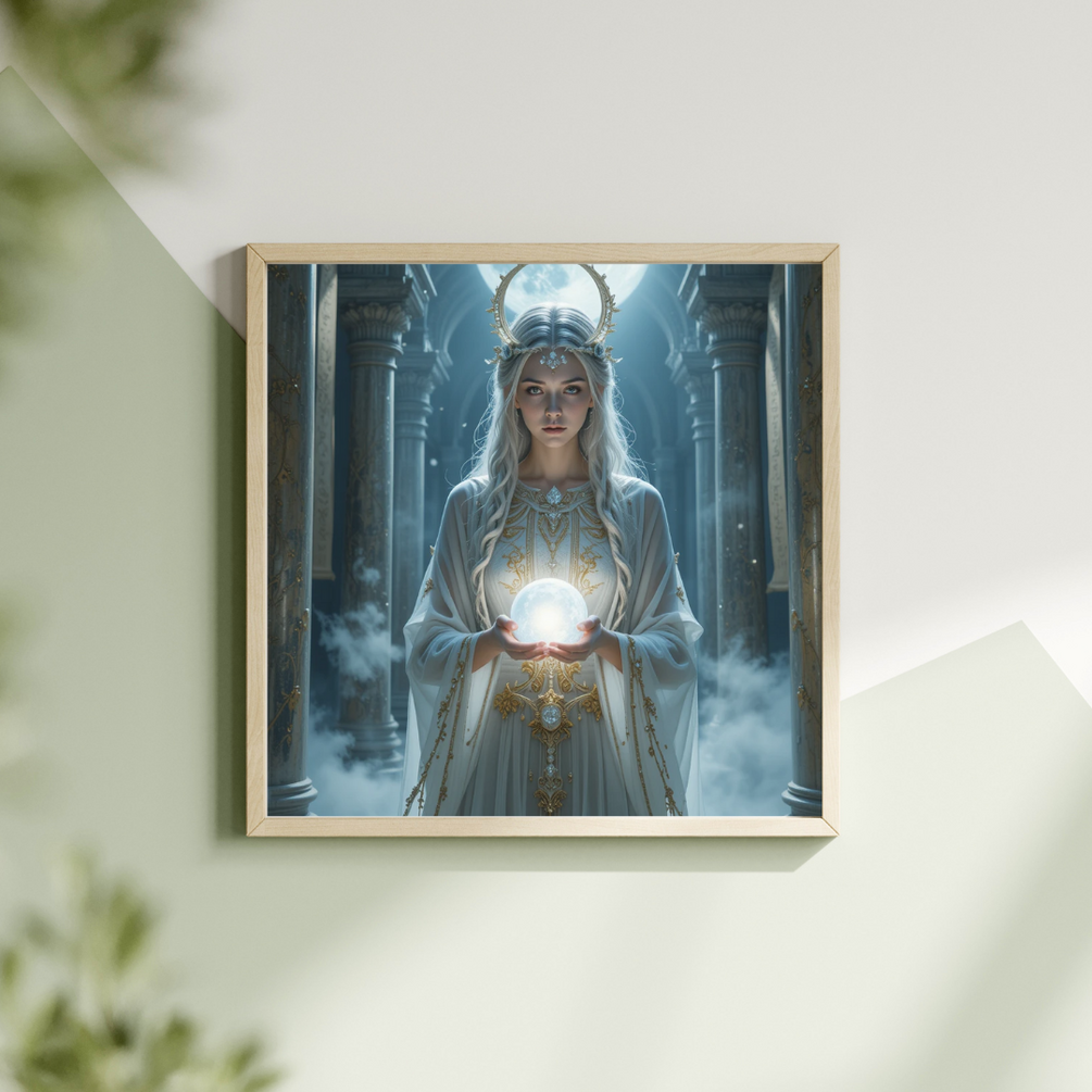 Step into the realm of celestial magic with this high-resolution digital artwork. Featuring a moonlit oracle holding a glowing orb in a majestic temple, this piece radiates calm, power, and elegance.