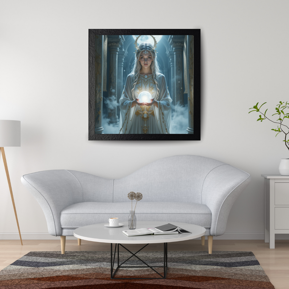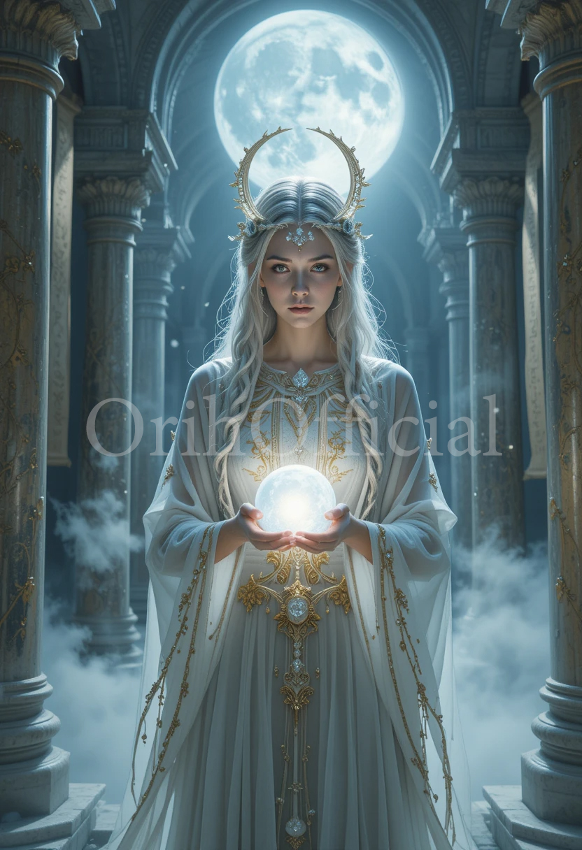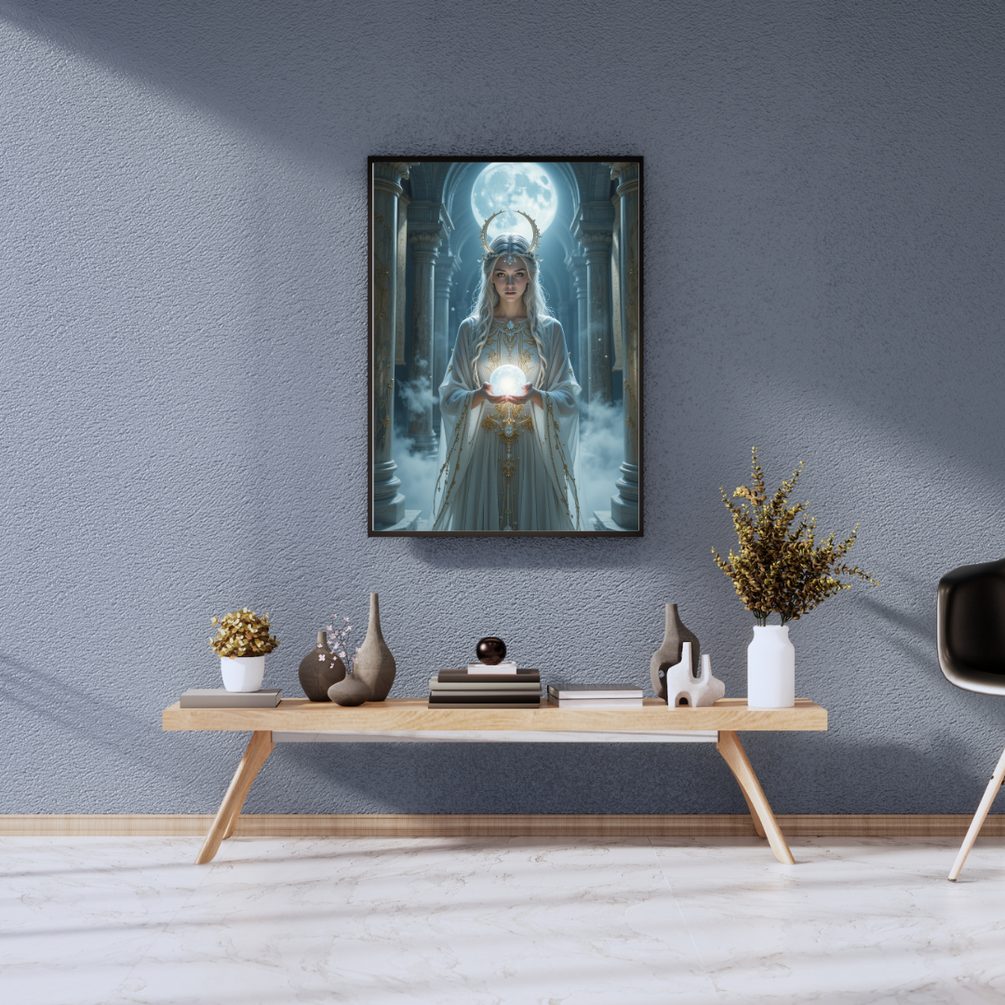 Step into the realm of celestial magic with this high-resolution digital artwork. Featuring a moonlit oracle holding a glowing orb in a majestic temple, this piece radiates calm, power, and elegance.